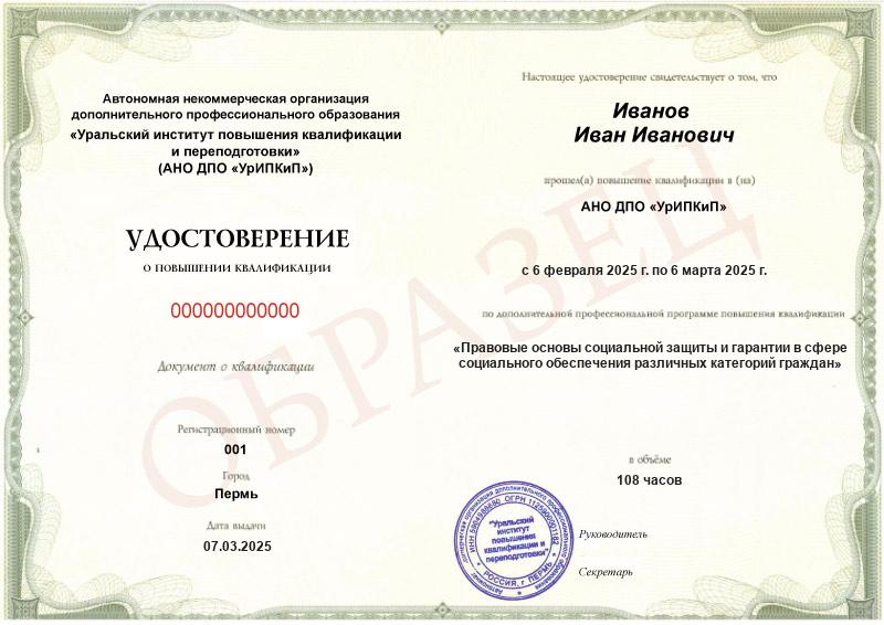 По факту успешного завершения программы повышения квалификации вы получите соответствующее удостоверение установленного образца. Ваша компетентность в правовых основах и гарантиях социальной защиты граждан заметно возрастёт, что обеспечит конкурентоспособность и карьерный рост. А тем, кто только освоил эти профессиональные навыки, поможет достаточно легко трудоустроиться и даст хороший старт.