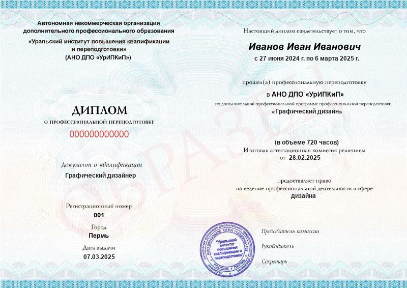 - Московский диплом о профессиональной переподготовке установленного образца с присвоением квалификации «Графический дизайнер».