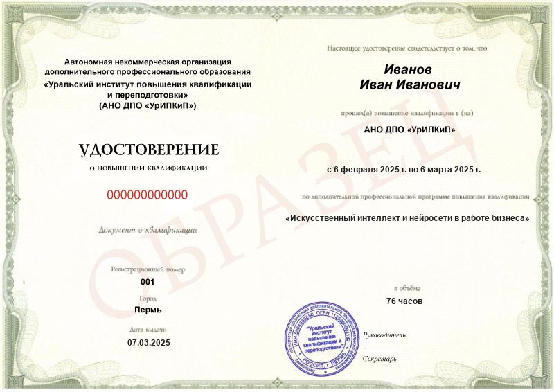 - Образец удостоверения о повышении квалификации.