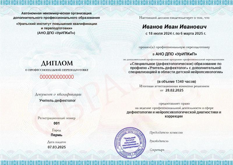 Курс обучения Специальное (дефектологическое) образование по профилю «Учитель-дефектолог» с дополнительной специализацией в области детской нейропсихологии (1340ч)
