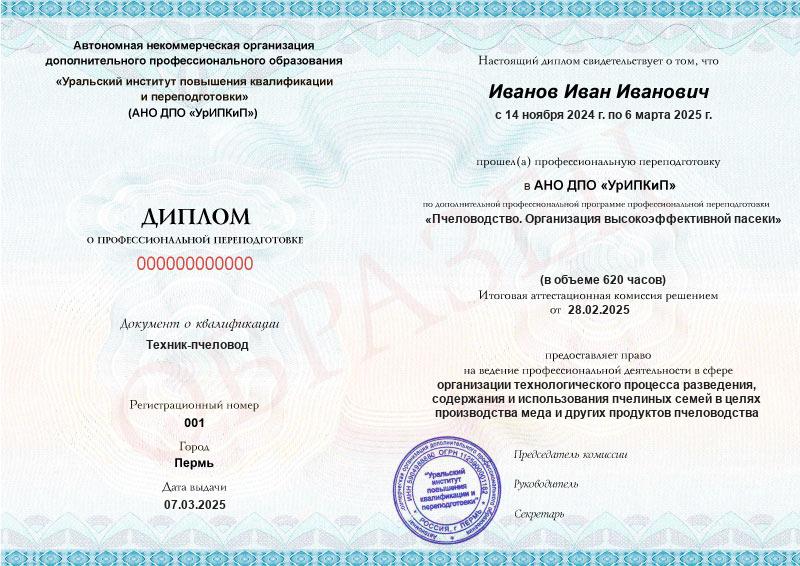 • Диплом о профессиональной переподготовке с присвоением квалификации «Техник-пчеловод». Вносится в Федеральный реестр документов об образовании.