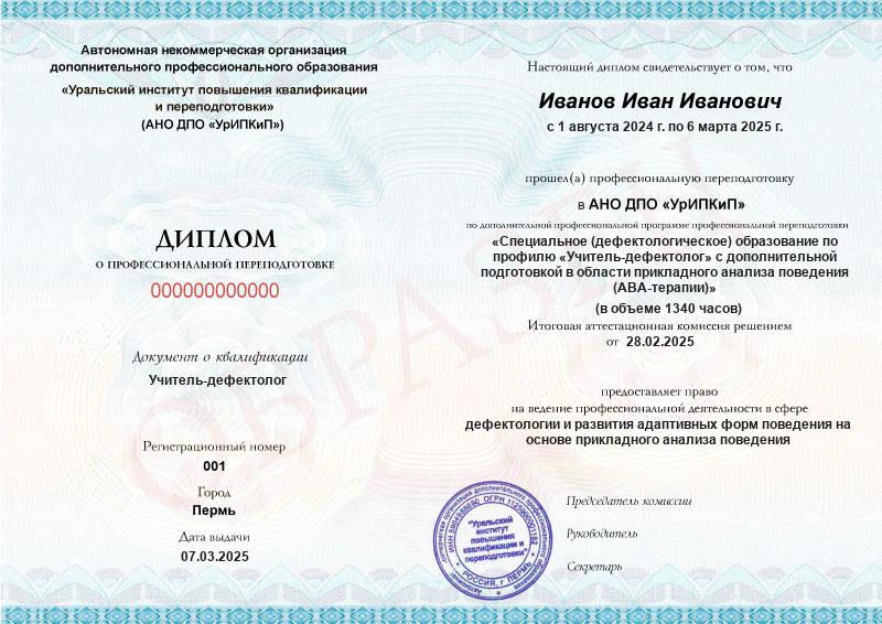 Специальное (дефектологическое) образование по профилю «Учитель-дефектолог» с дополнительной подготовкой в области прикладного анализа поведения (АВА-терапии) (1340ч)
