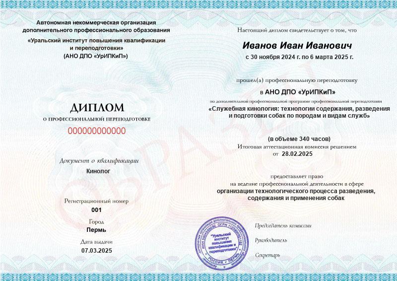 - Диплом о профессиональной переподготовке с присвоением квалификации «Кинолог». Вносится в Федеральный реестр документов об образовании.