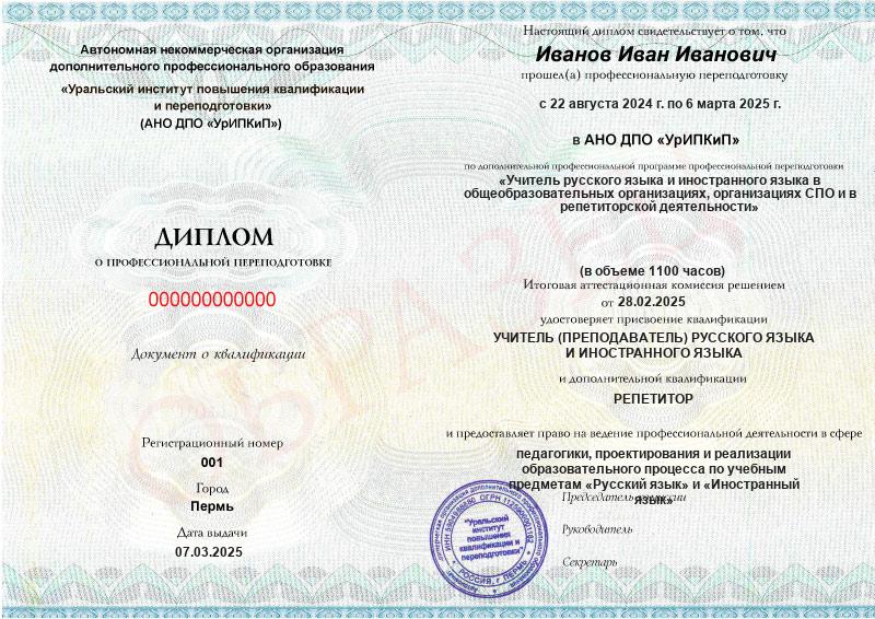 - 2 квалификации: Учитель (преподаватель) русского языка и иностранного языка + Репетитор